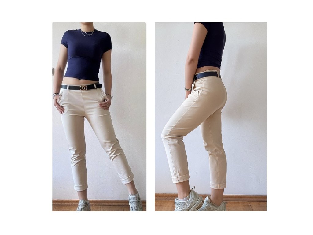 Tyto dámské béžové 7/8 kalhoty jsou univerzálním kouskem, který by neměl chybět v žádném šatníku. Díky neutrální barvě a modernímu střihu je snadno zkombinuješ s tričkem, halenkou i sakem. Ohrnutý lem dodává ležérní šmrnc a dvě přední kapsy přidávají na praktičnosti.