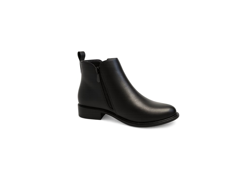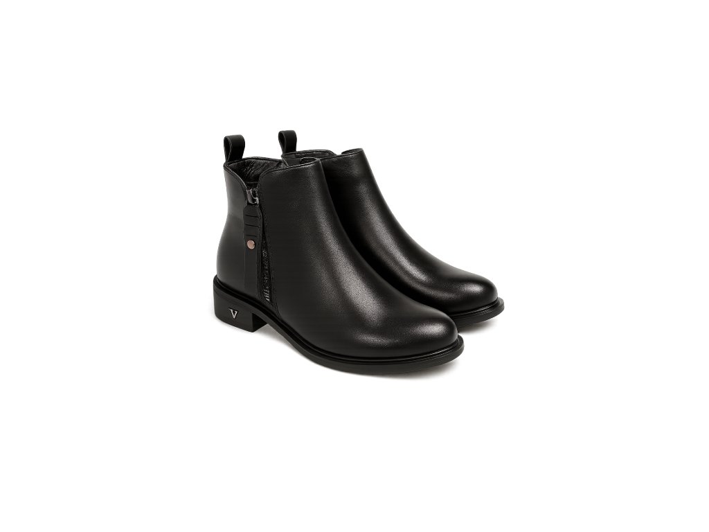 Elegantní dámské kotníkové boty v černé barvě, vyrobené z kvalitní imitace kůže (koženky), vás zaujmou svým minimalistickým, ale vkusným designem. Mírně zateplený vnitřek je ideální do chladnějšího počasí podzimu i začátku zimy. Zapínání na boční zip zajišťuje snadné obouvání. Ozdobný zip na vnější straně a kovový detail na patě s písmenem "V" dodávají botám stylový šmrnc. Praktický nízký podpatek zaručuje pohodlí i při celodenním nošení. Model H20582A je univerzální a snadno kombinovatelný s různými outfity.