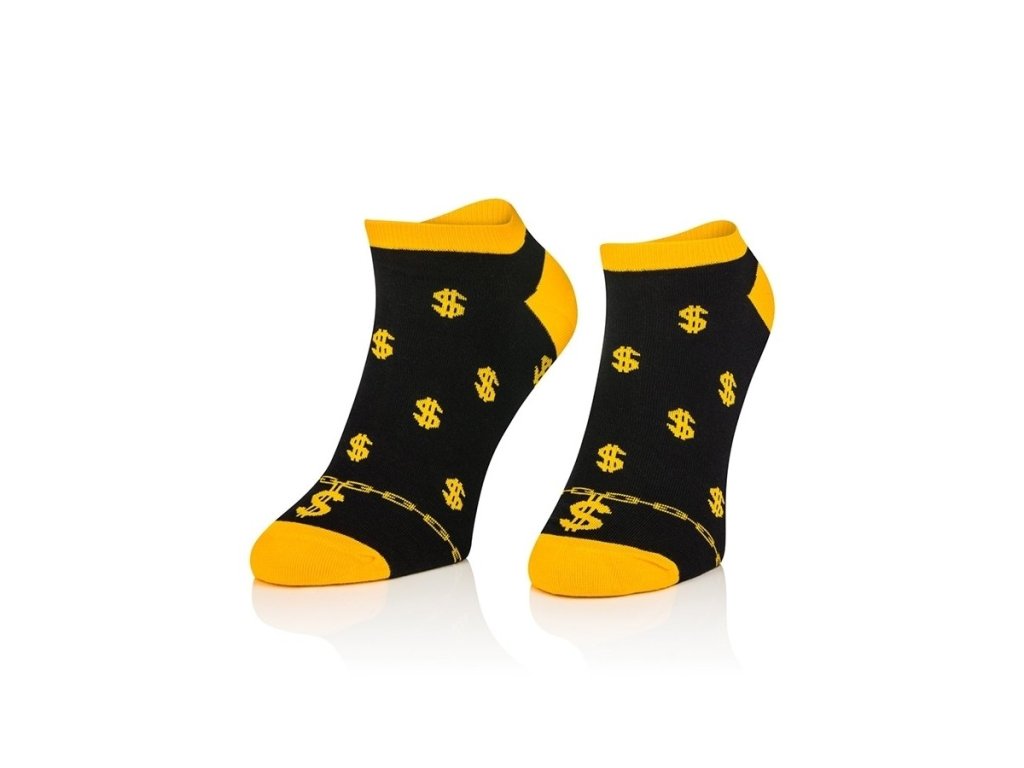 Dolaď svůj outfit do posledního detailu! Tyto veselé kotníkové ponožky Dollar přinášejí jedinečný design s motivem dolarových znaků 💲 v kontrastní kombinaci černé a žluté barvy. Jsou ideální pro všechny, kteří se nebojí vystoupit z davu a chtějí svým stylem ukázat smysl pro humor i originalitu.